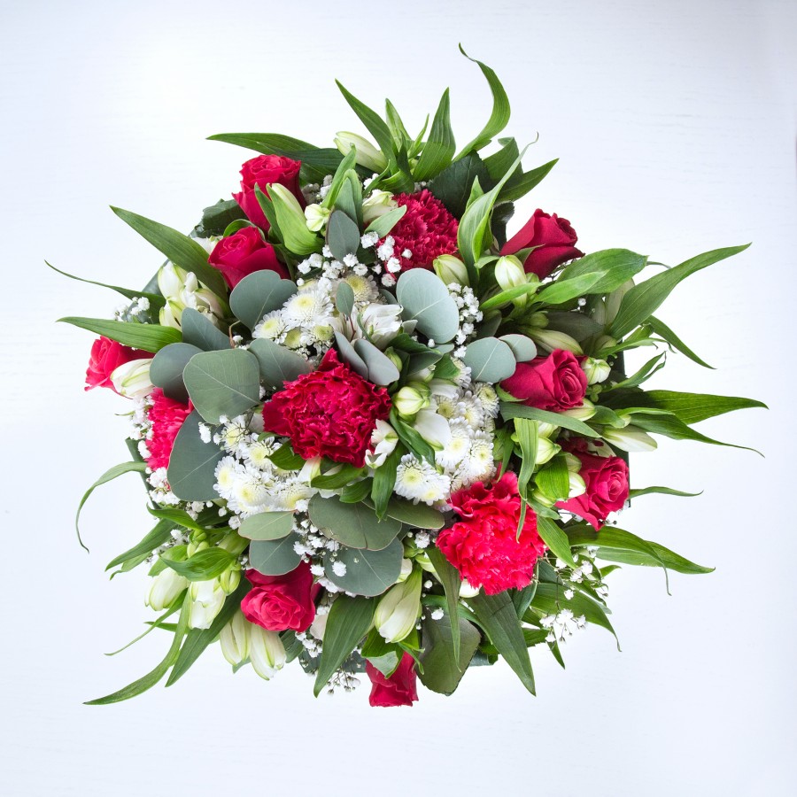 Enchant your senses with this opulent bouquet, a true masterpiece of floral artistry. Featuring an alluring mix of classic red roses and soft white chrysanthemums, this arrangement is accented by lively carnations and the ethereal touch of gypsophila. Elegant white alstroemeria and textured aspidistra leaves complete the design, creating a stunning interplay of vibrant and subtle hues.