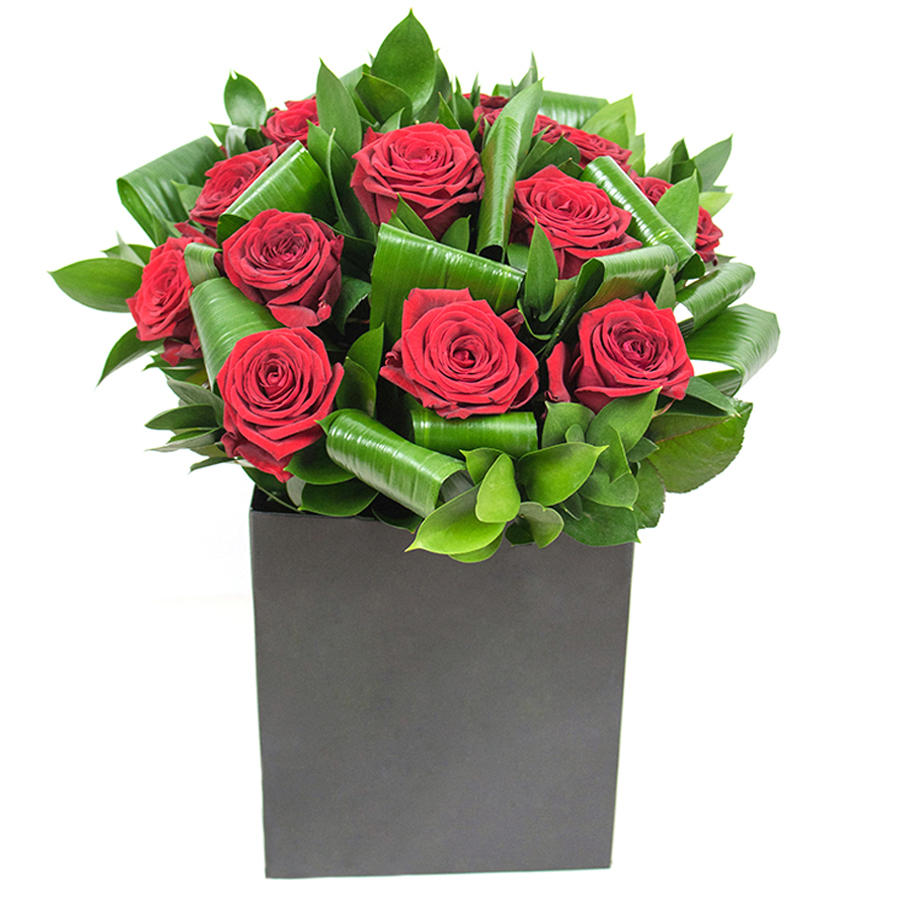 Celebrate beauty with our captivating bouquet, featuring vibrant red roses, rich aspidistra foliage, and refined ruscus. This unique arrangement exudes style and grace, perfect for any setting.