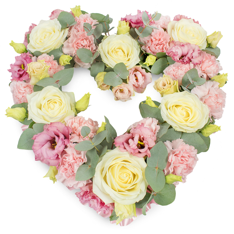 Honor your loved ones with our Elegant Tribute Heart Bouquet. This beautiful arrangement features pristine white roses, charming pink carnations, delicate pink lisianthus, and aromatic eucalyptus, all thoughtfully arranged into a heart shape to symbolize love and remembrance.